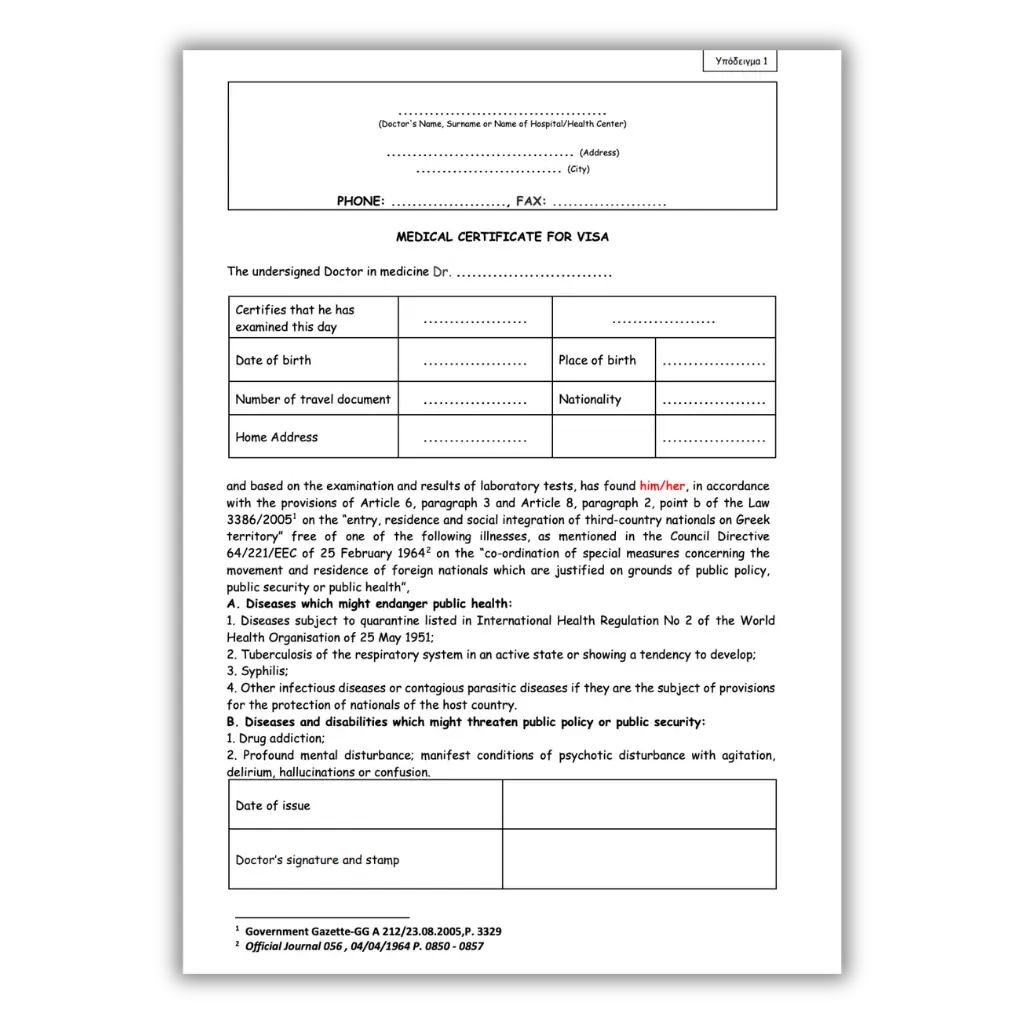 If you are applying for a Greek long-stay visa (Type D), you may be required to submit a medical certificate confirming that you do not suffer from certain infectious diseases that could pose a risk to public health. This certificate must be completed and signed by a doctor and submitted as part of your visa application to the Greek authorities.