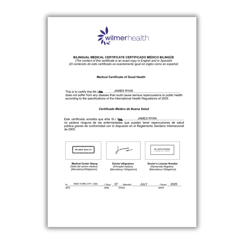 Every certificate we issue is reviewed, signed, and stamped by a licensed physician, prepared in line with International Health Regulations (IHR 2005), and issued using a bilingual (English & Spanish) format. We provide both a digital copy and an original physical certificate with a wet-ink signature, delivered directly to your United States mailing address.