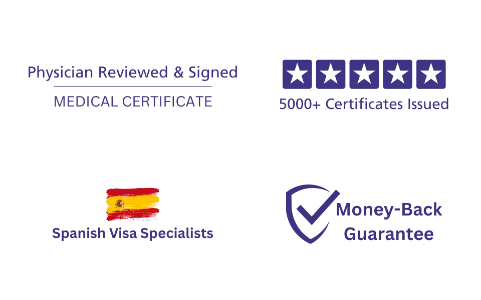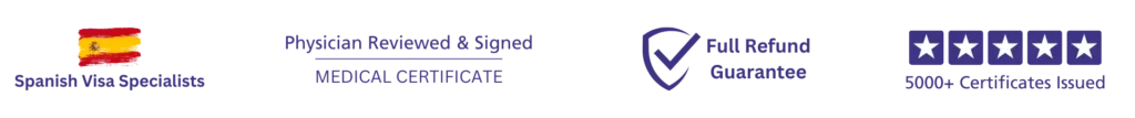 Each certificate is prepared individually, includes the physician’s name, signature, stamp, and licence number, and is issued on medical letterhead. This ensures the document is professionally prepared and suitable for use in Spanish visa applications.